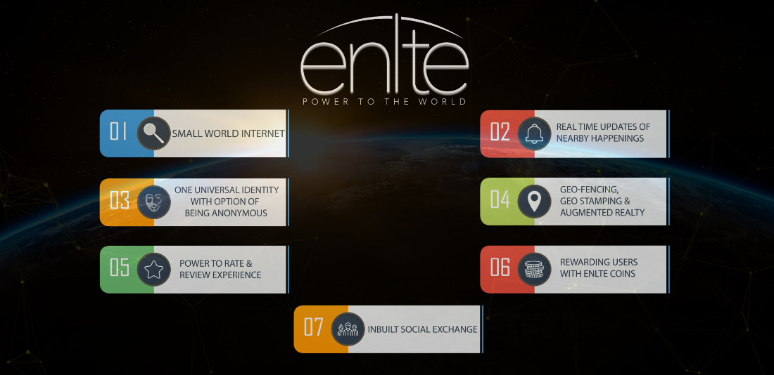 FITUR APP ENLTE: Dunia Kecil Internet Pembaruan real-time terjadi di sekitar Satu sistem identifikasi universal dengan opsi gratisGo-fancing, geo-stamping dan augmented realityPower untuk menilai dan meninjau pengalamanMenerima Hadiah membantu orang lain dan menyebarkan kesadaranInbuiltInformationFORFORMEN TOKEN DAN ICO